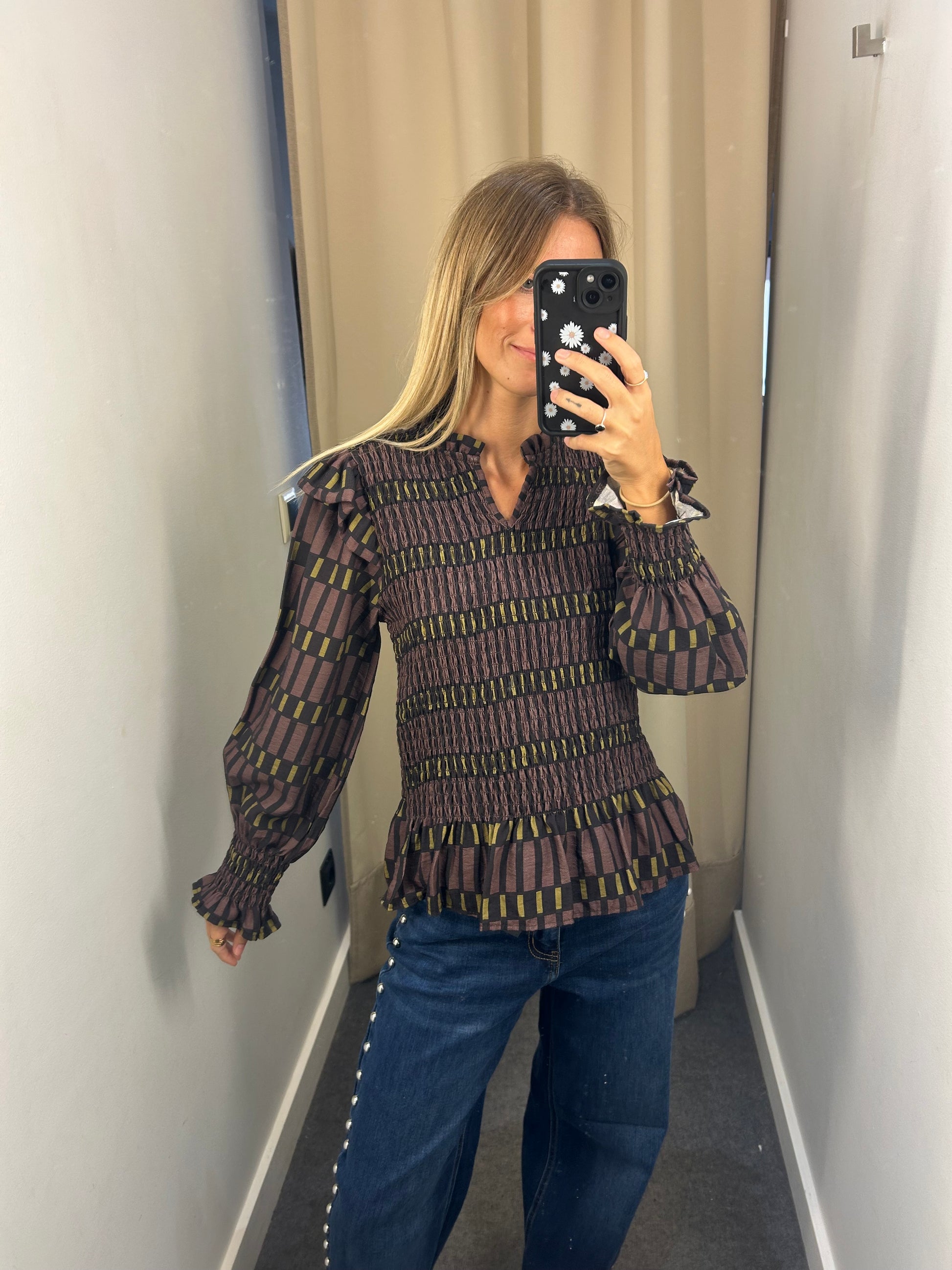 Prenda que celebra la textura y el color. Efecto fruncido con tonalidades marrones .