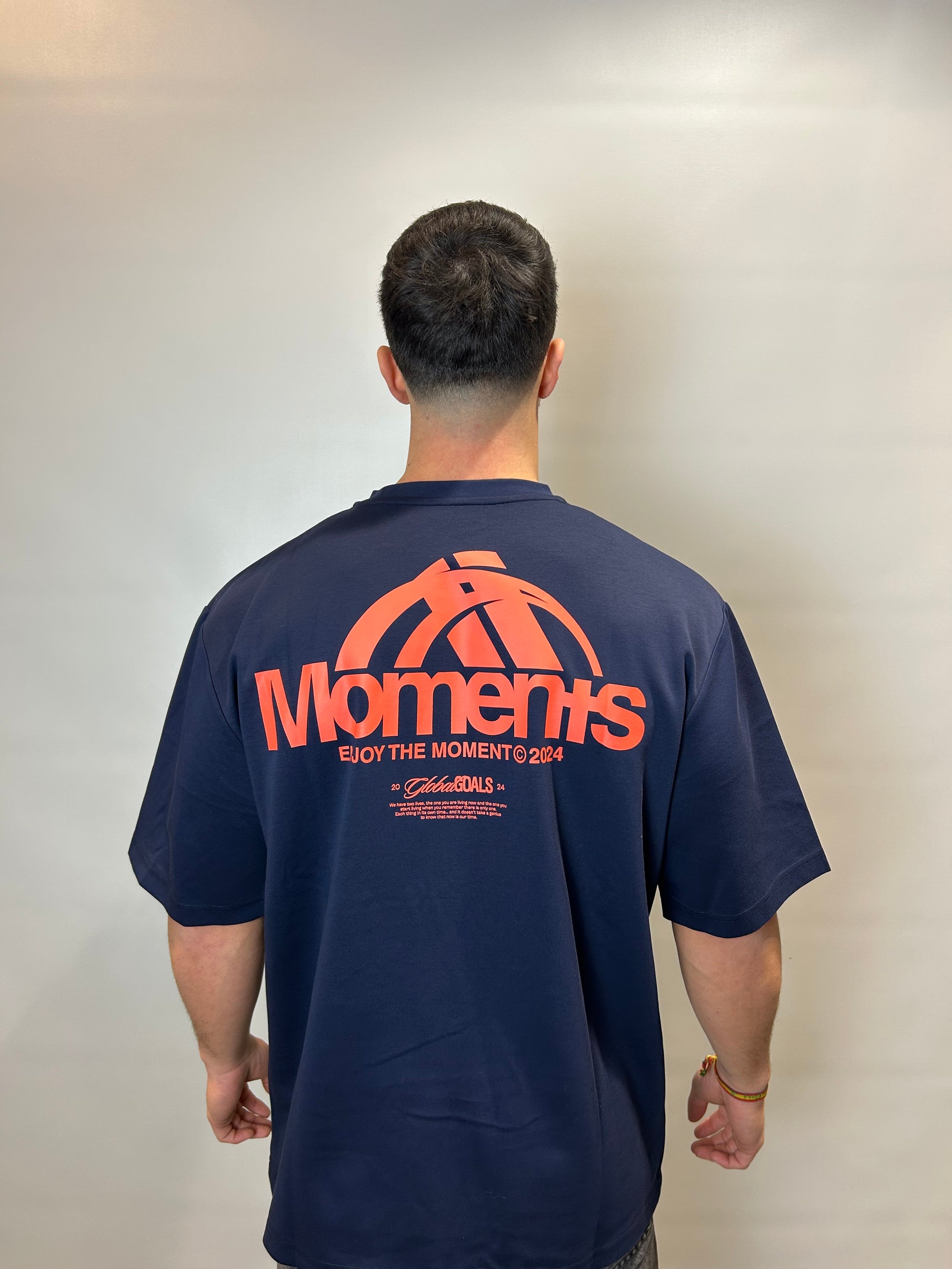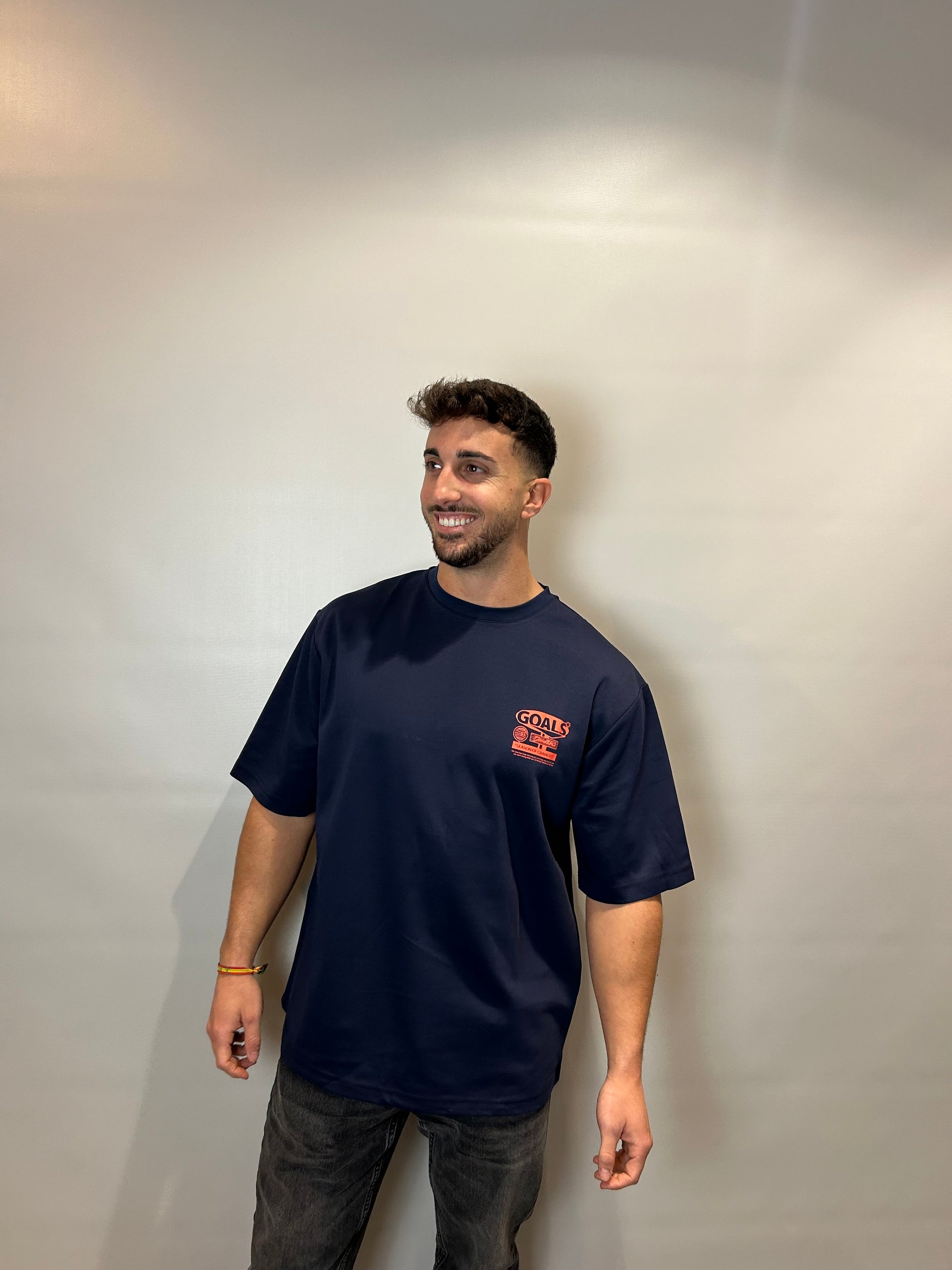 Camiseta oversize en color azul marino. El modelo usa de esta camiseta la M.