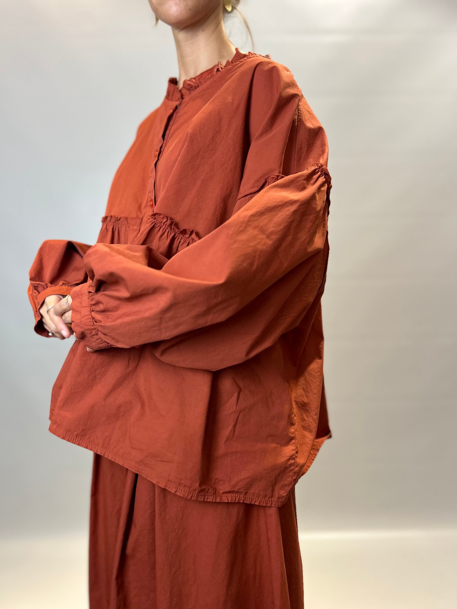 Conjunto en color teja, compuesto por camisa y pantalón ancho. Fresco, versátil y elegante, perfecto para looks casuales o formales. Con elástico en la parte trasera.