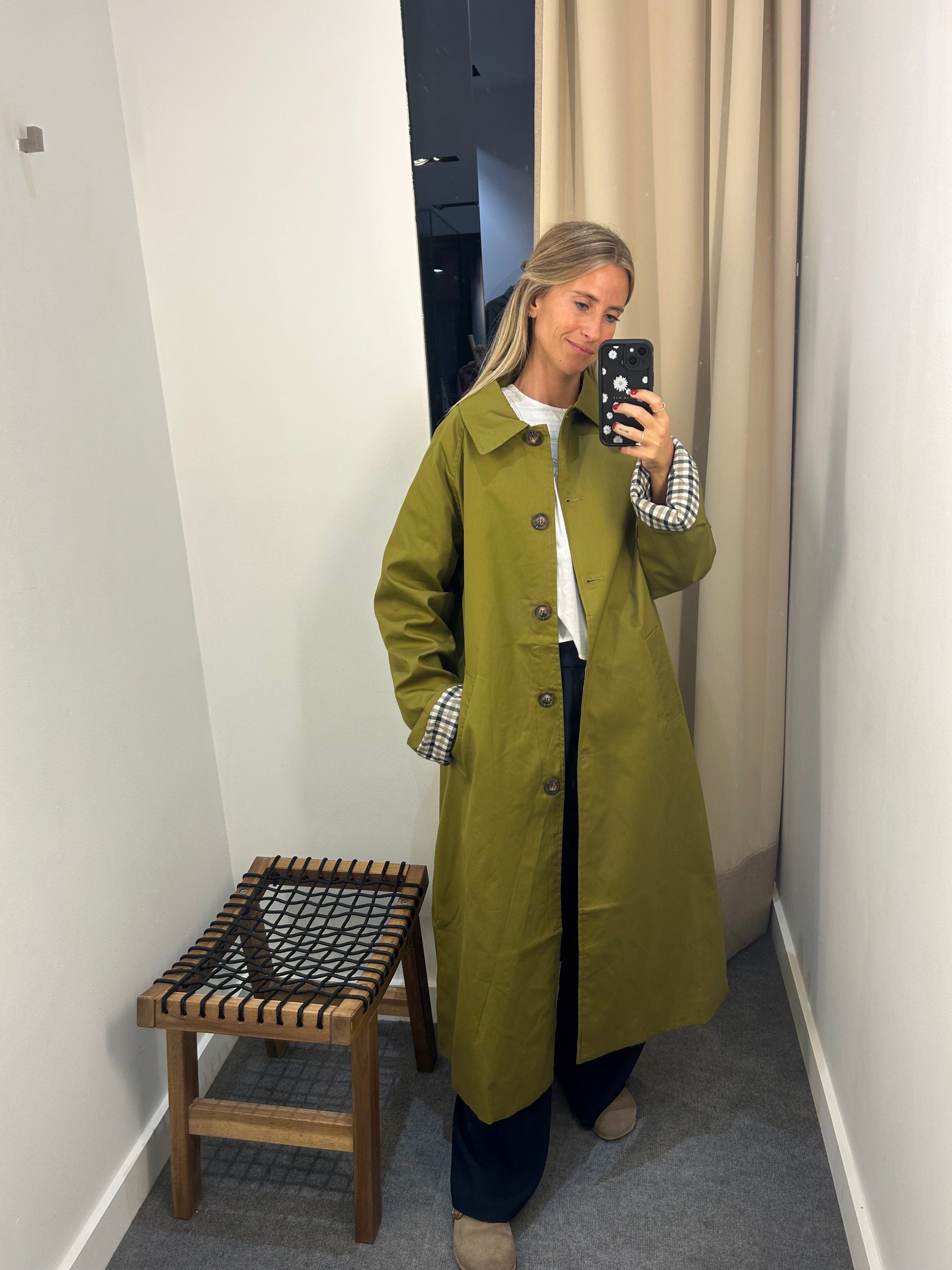 Chaqueta Gabardina , en color oliva con el forro en estampado de cuadros . Ideal para marcar estilo y tendencia.