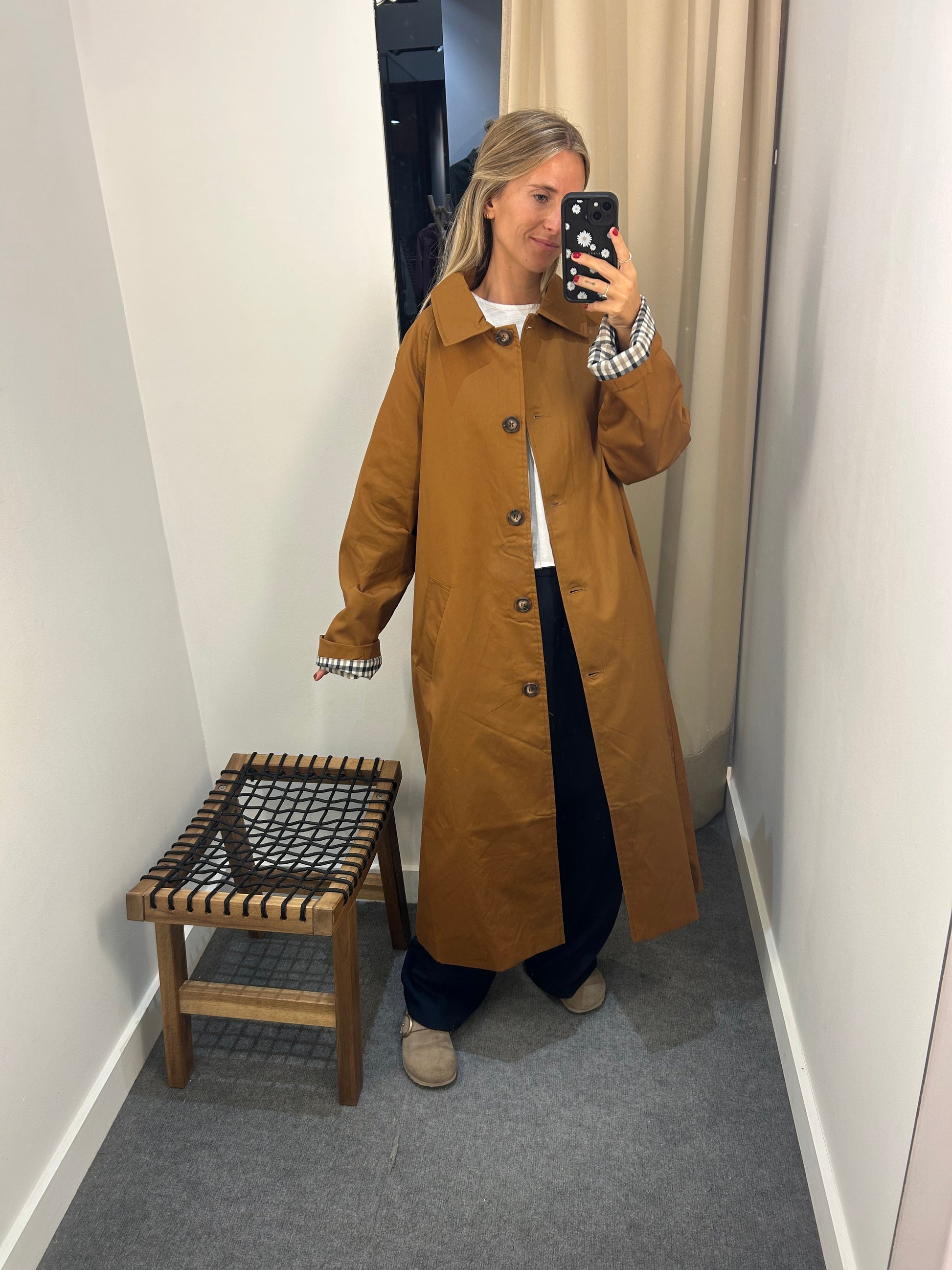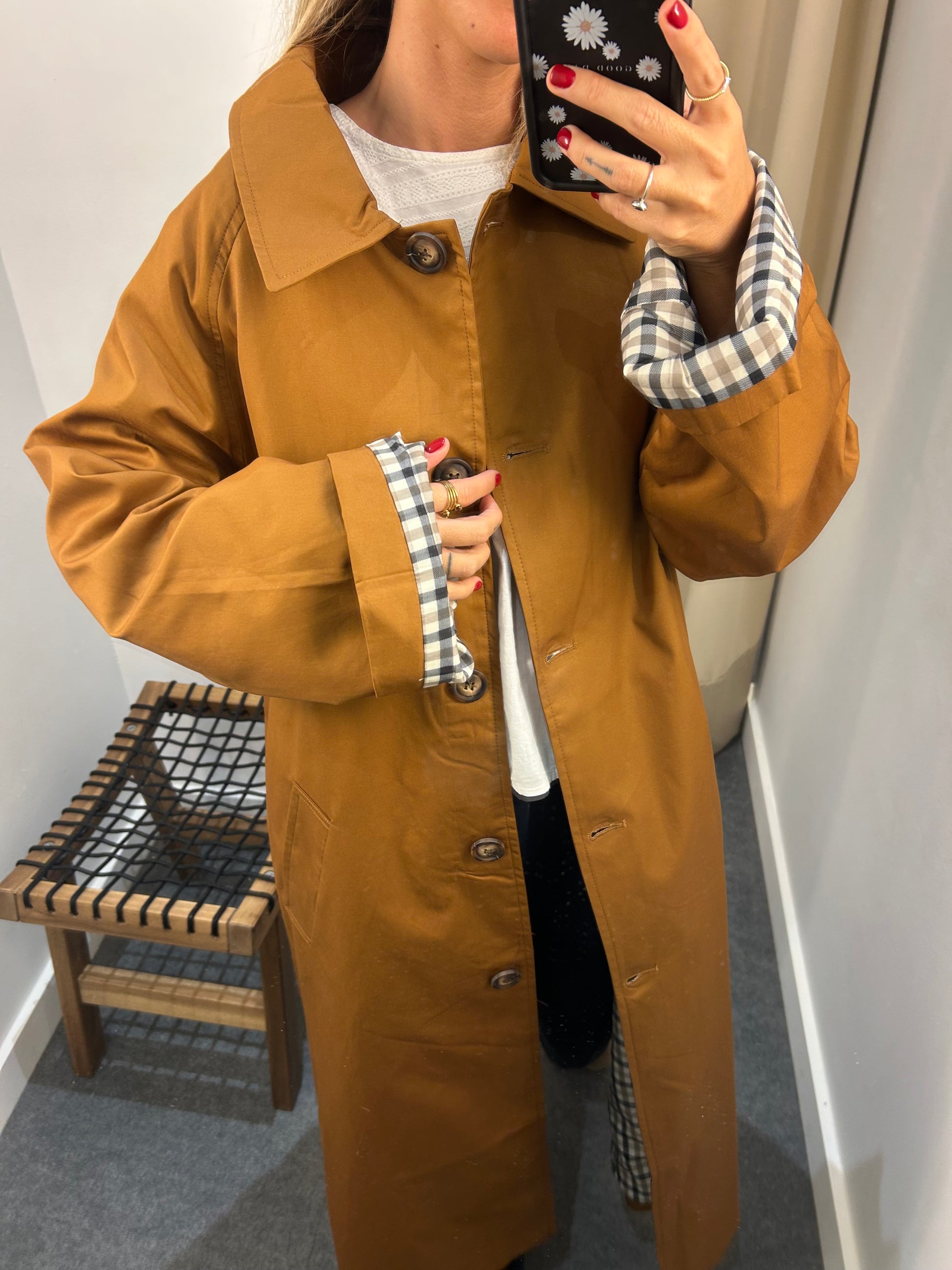Chaqueta Gabardina Color teja , con forro en estampado de cuadros. Ideal para marcar tendencia y elegancia .